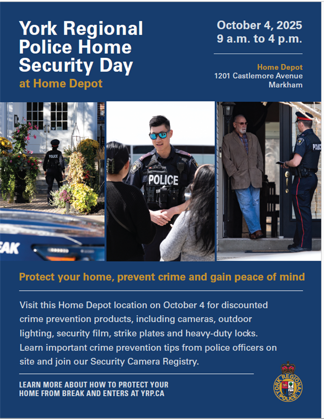 YRP is hosting a Home Security Day at the Home Depot location on 1201 Castlemore Ave, to educate the public on how best to safeguard their homes. As part of the YRP's Break & Enter initiative, Home Depot will be offering a 10% discount on crime prevention items (i.e. cameras, outdoor lighting, security film, strike plates and heavy-duty locks). YRP officers will also be on-site to help educate the public.