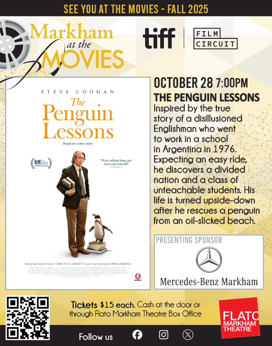 Penguin Lessons starring Steve Coogan, Jonathan Pryce, Vivian El Jaber. Based on a true story, the audience follows a disillusioned Englishman who goes to work in a school in a divided Argentina in 1976 find his life transformed when he rescues an orphaned penguin from the beach. Tickets are $15 at the door or through Flato Markham Box Office. |