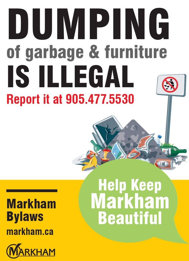 Report large dumped items to customerservice@markham.ca with location and photos.